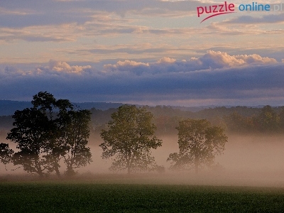 Puzzle Łąka, Chmury, Mgła, Drzewa