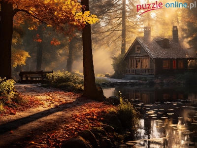 Mgła, Drzewa, Jesień, Liście, Ścieżka, Staw, Słoneczny blask, Dom, Most