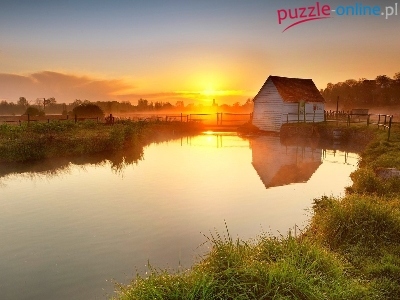 Mgła, Łąki, Słońca, Rzeka, Dom, Wschód
