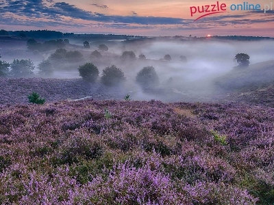 Puzzle Mgła, Wrzosowisko, Drzewa, Wzgórza