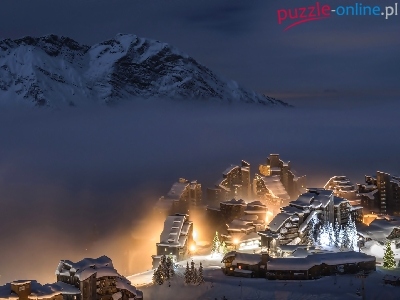 Mgła, Domy, Noc, Zima, Góry, Śnieg