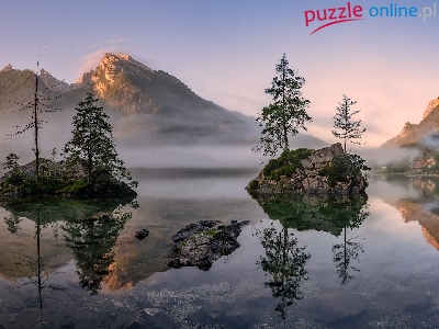 Drzewa, Niemcy, Hintersee, Mgła, Jezioro, Bawaria, Skały