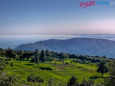 Puzzle Łąki, Morze, Mgła, Wzgórza