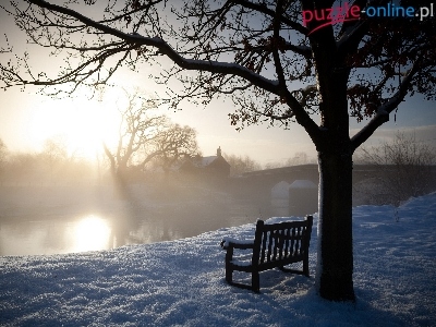 Mgła, Zima, Rzeka, Most, Ławka