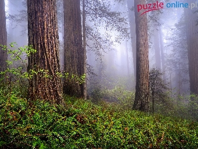 Kalifornia, Sekwoje, Mgła, Park Narodowy Redwood, Drzewa, Stany Zjednoczone, Las, Paprocie