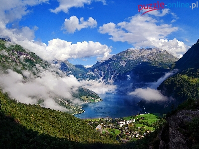 Malowniczy, Góry, Mgła, Wioska, Norwegia, Fiord Geiranger, Skały