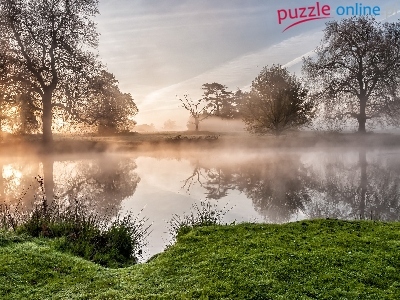 Mgła, Drzewa, Jezioro, Wschód słońca, Odbicie