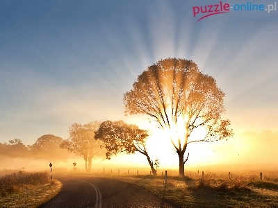 Mgła, Drzewa, Wschód, Słońca, Droga