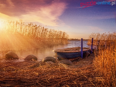 Puzzle Mgła, Jezioro, Wschód słońca, Łódź