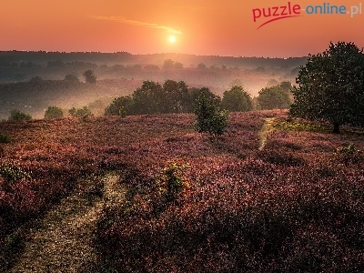 Mgła, Wschód słońca, Wrzosowisko, Wrzos, Drzewa
