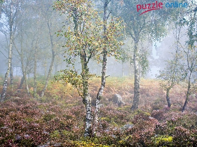 Brzozy, Park Narodowy Peak District, Anglia, Mgła, Jesień, Wrzosy, Hrabstwo Derbyshire