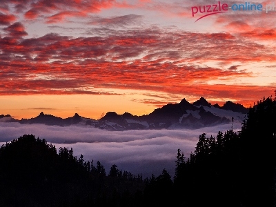 Puzzle Mgła, Góry, Chmury, Zachód Słońca