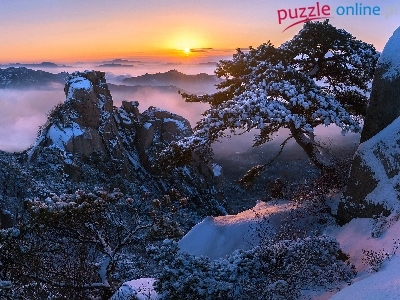 Mgła, Park Narodowy Bukhansan, Drzewa, Prowincja Gyeonggi-do, Sosna, Zima, Wschód słońca, Korea Południowa, Góra Dobongsan, Skały