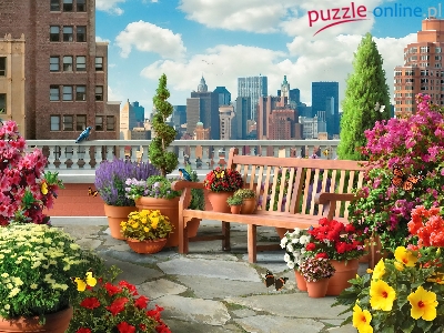 Miasta, Domy, Kwiaty, Taras, Panorama, Ławka