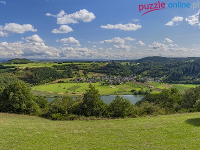 Drzewa, Pole, Wzgórza, Miasteczko, Jezioro, Domy