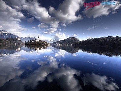 Puzzle Miasteczko, Woda, Góry, Odbicie
