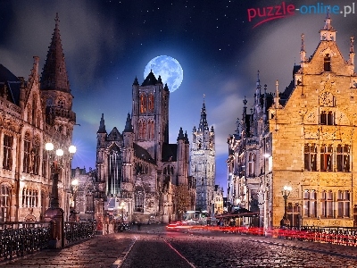 Puzzle Miasto nocą, Ulica, Domy, Księżyc