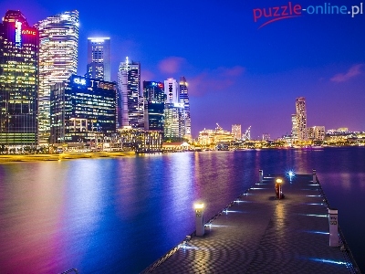 Miasto, Zatoka, Singapur, Wieżowce, Molo, Noc