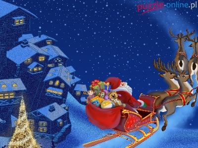 Renifery, Miasto, Sanie, Boże Narodzenie, Noc, Mikołaj