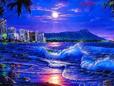 Puzzle Miasto, Fale, Wybrzeże, Noc