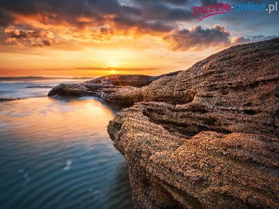 Morze, Miejscowość Rawda, Zachód słońca, Bułgaria, Skały, Chmury