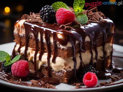 Mięty, Ciasto, Talerz, Deser, Jeżyny, Czekoladowe, Krem, Listki, Maliny, Polewa