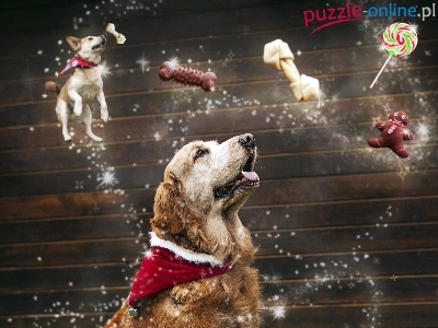 Puzzle Mikołaja, Pies, Czapka, Przysmaki