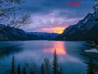 Jezioro Minnewanka, Wschód Słońca, Kanada, Prowincja Alberta, Góry