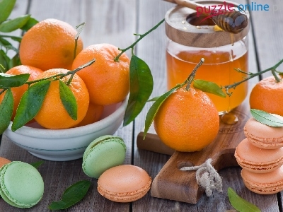 Mandarynki, Miód, Makaroniki, Deska, Kompozycja, Liście, Ciastka