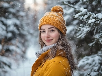Ośnieżone, Gałązki, Czapka, Kobieta, Szatynka, Kurtka, Zima, Miodowa