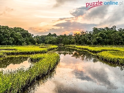 Moczary, Odbicie, Rzeka, Las, Chmury