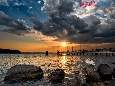 Chmury, Molo, Łabędzie, Zachód słońca, Kamienie, Jezioro