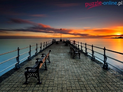 Puzzle Molo, Zachód słońca, Morze, Ławki