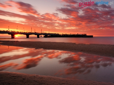 Puzzle Morze, Molo, Plaża, Zachód słońca
