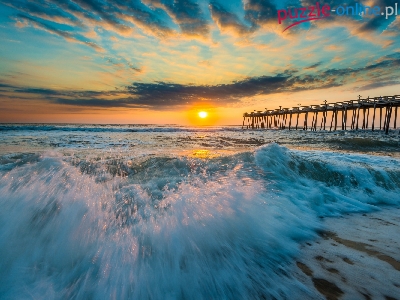 Molo, Chmury, Morze, Fale, Zachód Słońca