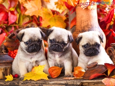 Mopsy, Słodkie, Jesień, Trzy, Szczeniaczki, Liście