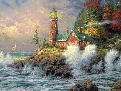 Skały, Latarnia, Thomas Kinkade, Morze, Morska, Domek
