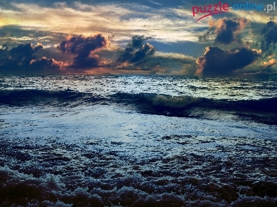Puzzle Morze, Zachód Słońca, Chmury, Fale