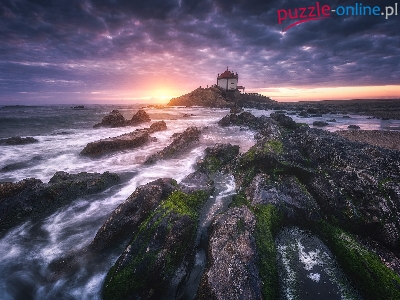 Skały, Zachód słońca, Morze, Miramar, Kapliczka, Capela do Senhor da Pedra, Portugalia, Kościół