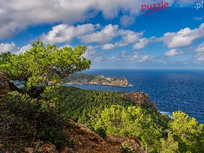 Roślinność, Chmury, Drzewa, Majorka, Andratx, Skały, Hiszpania, Morze