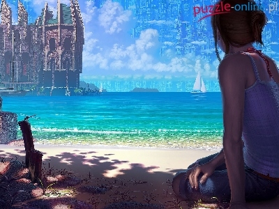Dziewczyna, Morze, Żaglówka, Plaża, Grafika, Ważka, Zamek