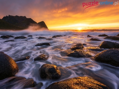 Puzzle Kamienie, Morze, Góry, Zachód słońca