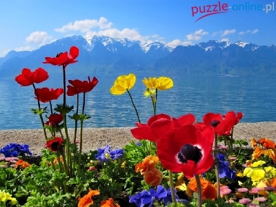Puzzle Morze, Kolorowe, Kwiaty, Chmury