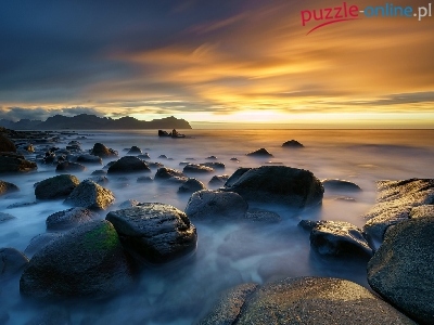 Morze, Zachód słońca, Norwegia, Lofoty, Skały