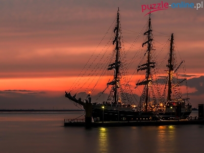 Morze, Słońca, Żaglowiec, Molo, Zachód