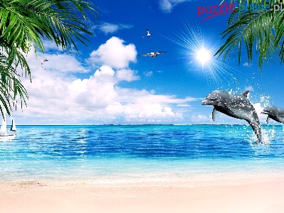 Puzzle Morze, Błękitne, Niebo, Delfiny