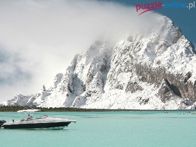 Puzzle Morze, Góry, Śnieg, Motorówka