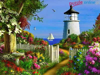 Puzzle Morze, Latarnia Morska, Ogród, Kwiaty