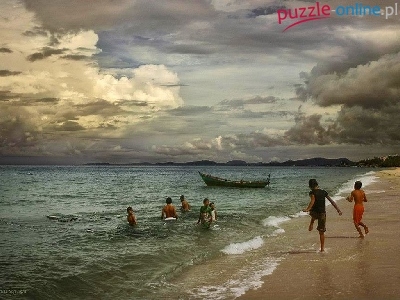Łódź, Plaża, Dzieci, Morze, Chmury