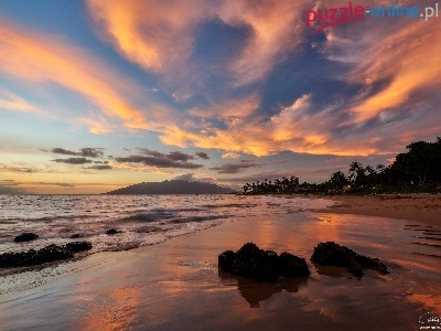 Morze, Zachód słońca, Hawaje, Plaża, Palmy